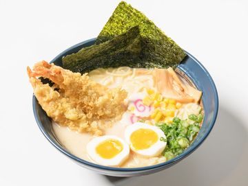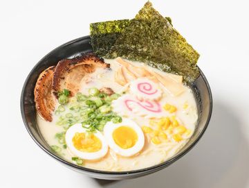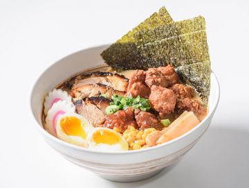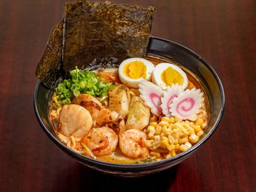 Silky noodles in rich spicy miso broth topped with tender chasu pork, chicken karaage, soft boiled egg, naruto fish cake, nori, sweet corn, scallion, and bamboo shoot